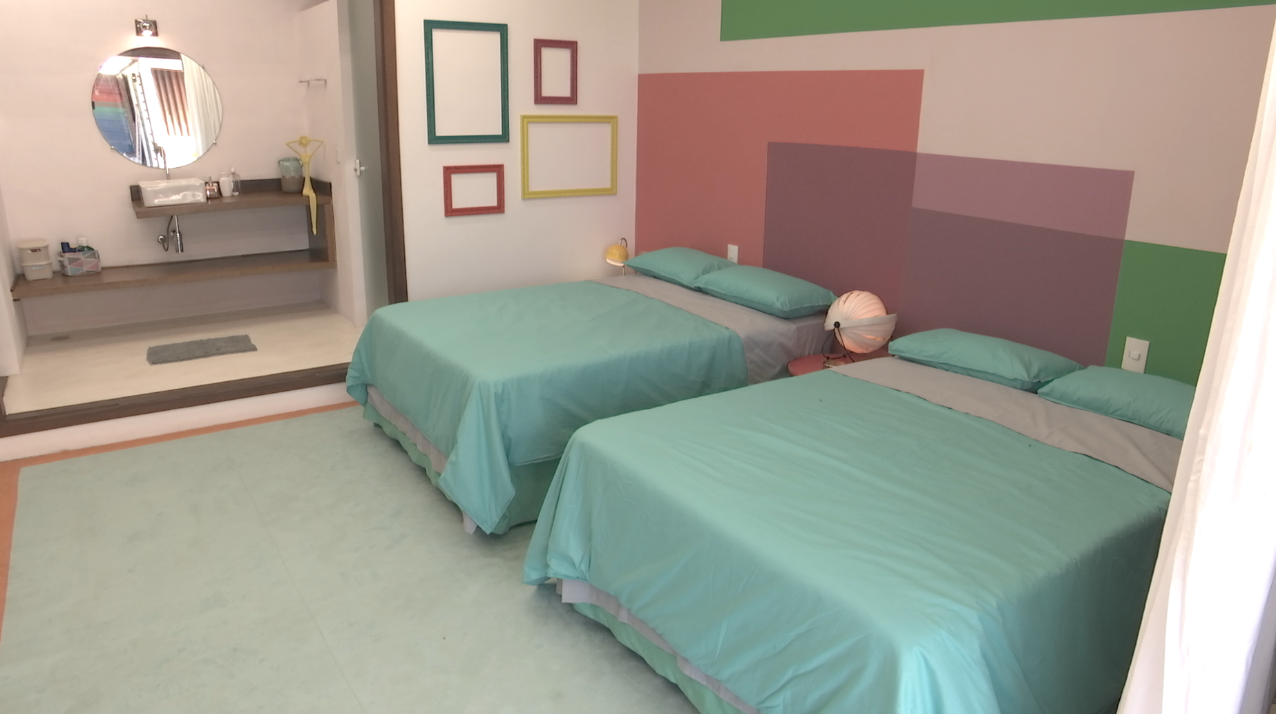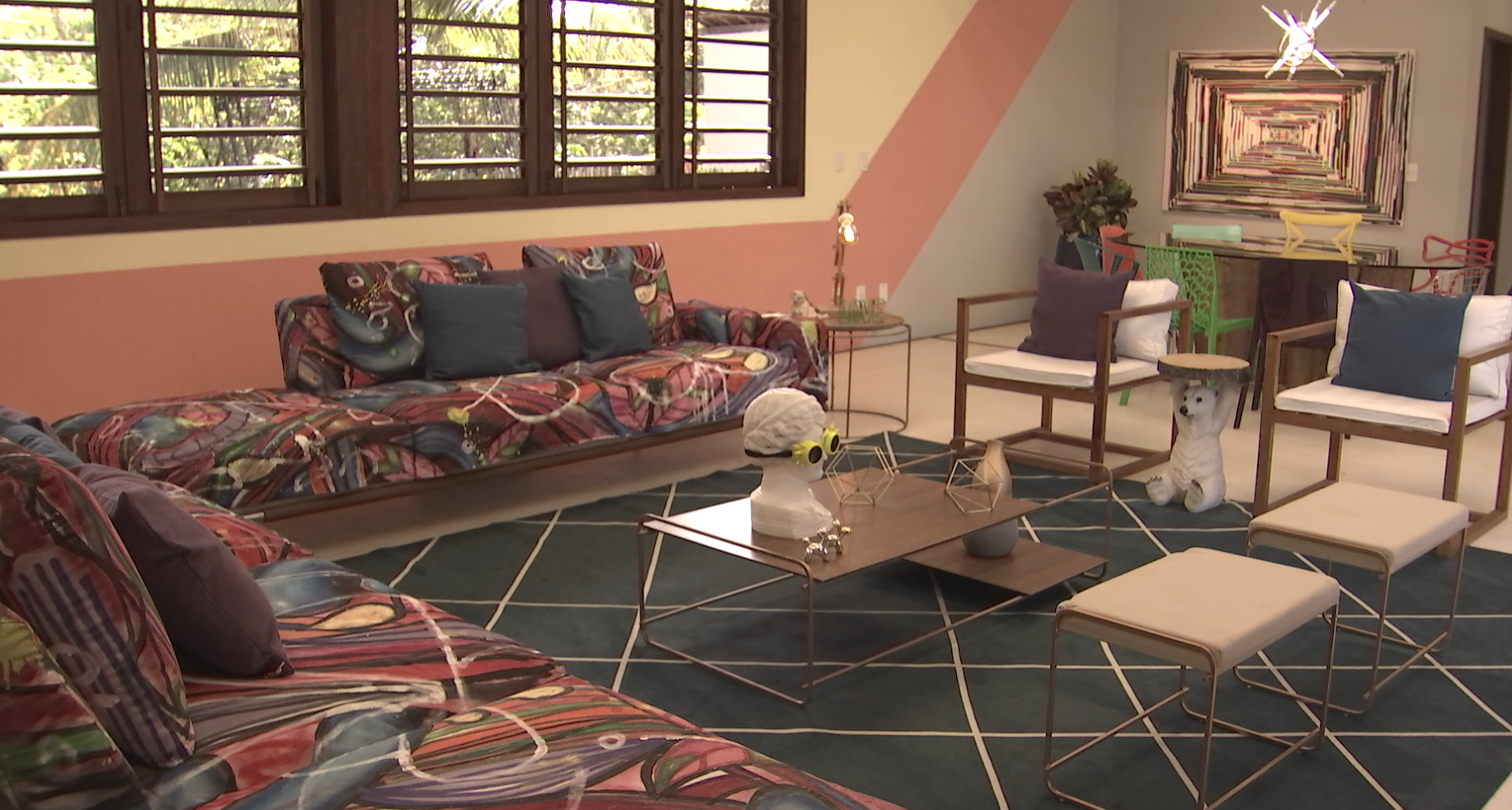 “Nessa edição priorizamos uma cartela de cores que remete ao verão, com algumas texturas que trazem jovialidade. É o caso do cobogó de concreto, o papel de parede geométrico multicolorido, as cores atuais da bancada da cozinha e o jogo do dual color da suíte máster”, diz Giselle Pedrão, diretora de arte da sexta temporada do De Férias com o Ex Brasil.