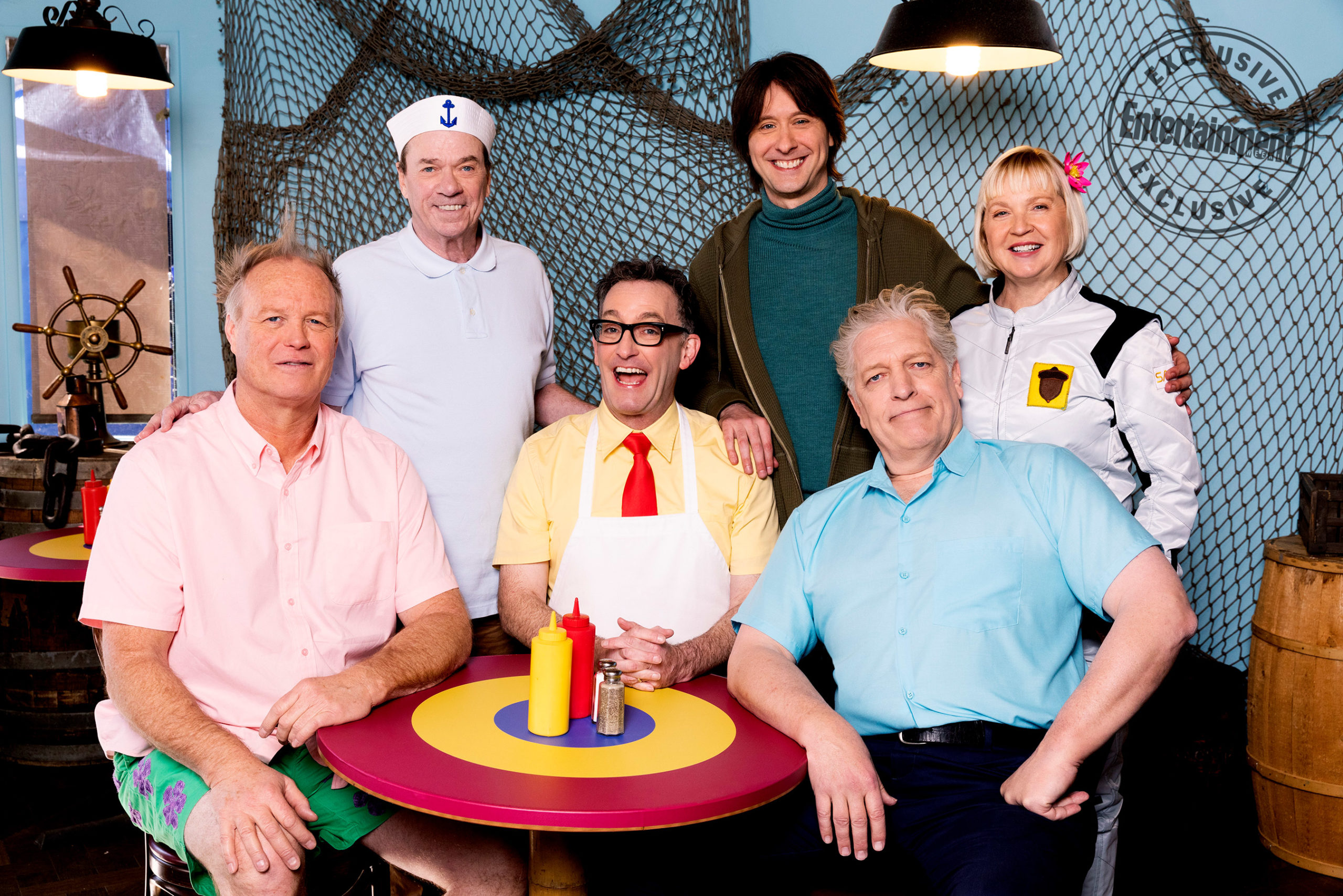 Na imagem em destaque, da esquerda para a direita, é possível observar Patrick Estrela (Bill Fagerbakke), Lula Molusco (Rodger Bumpass), Bob Esponja (Tom Kenny), Plankton (Mr. Lawrence), Seu Sirigueijo (Clancy Brown) e Sandy (Carolyn Lawrence).